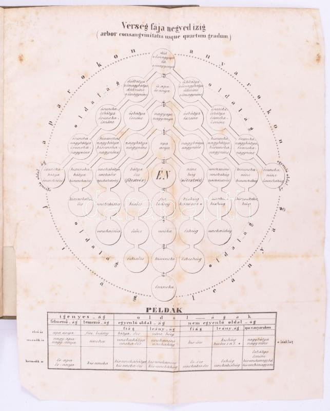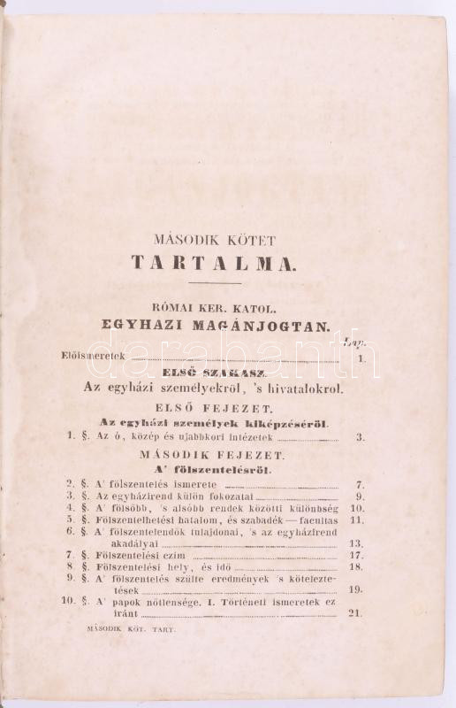Description: Udvardy Ignácz: Római ker. katolika egyházi magánjogtan. II. kötet. Budán, 1843., A' Magy. Kir. Egyetem' betűivel, VIII+335+1 p.+1 (Vérség fája negyed ízig) t. Korabeli átkötött aranyozott gerincű egészvászon-kötés, kopott, foltos borítóval, a címlapon és a táblán kis szakadással, foxing foltos lapokkal.