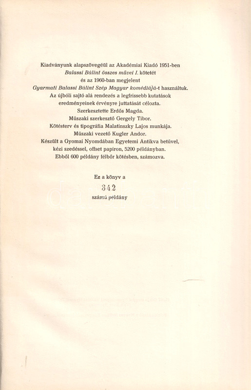 Könyvgyűjtők számára készült, számozott, bibliofil kiadás. Kolofon: "Kiadványunk alapszövegéül az Akadémiai Kiadó 1951-ben Balassi Bálint összes művei I. kötetét és az 1960-ban megjelent Gyarmati Balassi Bálint Szép Magyar komédiájá-t használtuk. Az újbóli sajtó alá rendezés a legfrissebb kutatások eredményeinek érvényre juttatását célozta. Sajtó alá rendezte Eckhardt Sándor. Az utószót Klaniczay Tibor írta. Illusztrálta Szász Endre. Szerkesztette Erdős Magda, műszaki szerkesztő Gergely Tibor. A kötésterv és tipográfia Malatinszky Lajos munkája. Műszaki vezető Kugler Andor. Készült a Gyomai Nyomdában Egyetemi Antikva betűvel, kézi szedéssel, offset papíron, 5200 példányban. Ebből 600 példány félbőr kötésben, számozva. Ez a könyv a 342. számú példány".