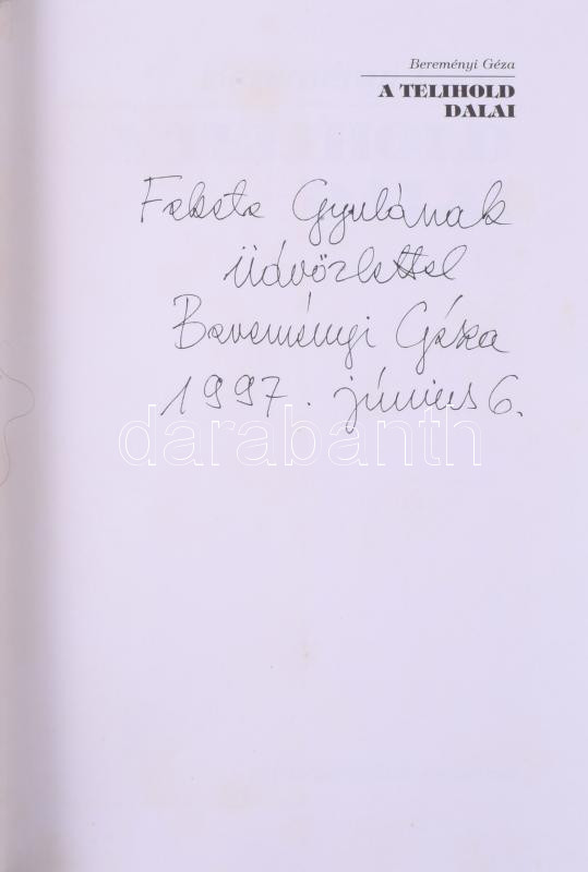 Bereményi Géza: A telihold dalai. [Bp.], 1997, Kulturtrade, 89+3 p. No... https://www.darabanth.com/en/516-Auction-philately-postcards-numismatics-artwork-books-collectibles-jewelry/520.0/Books/Books-Other-rarities~1106/Beremenyi-Geza-A-telihold-dalai-Bp-1997-Kulturtrade-89plus3-p-Novak-Emil-fotoival~II3501686