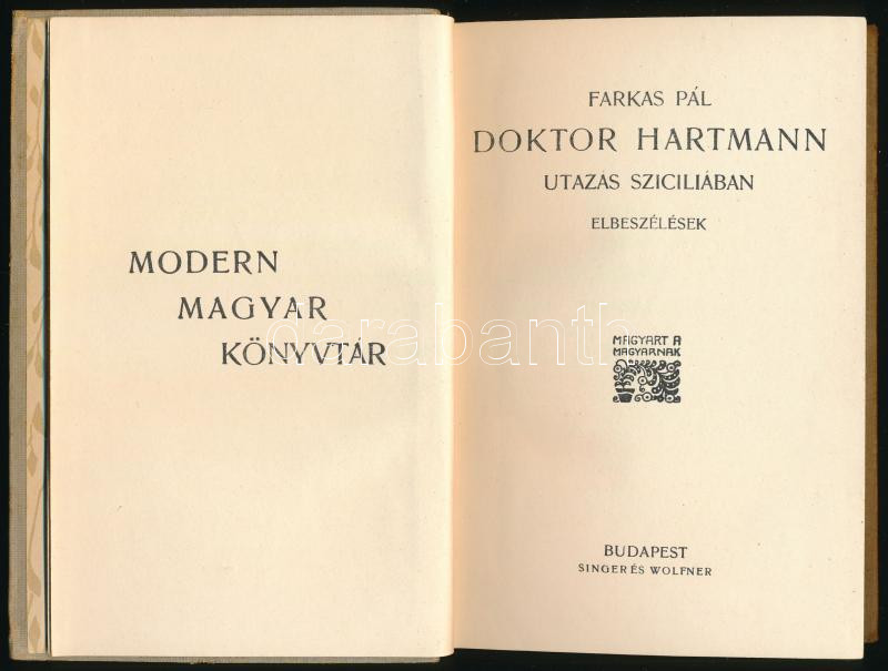 Farkas Pál: Doktor Hartmann. Utazás Szíciliában. Elbeszélések. Modern Magyar Könyvtár. Bp., én., Singer és Wolfner. Kiadói szecessziós egészvászon-kötés, kissé kopott borítóval, kissé foltos lapélekkel.