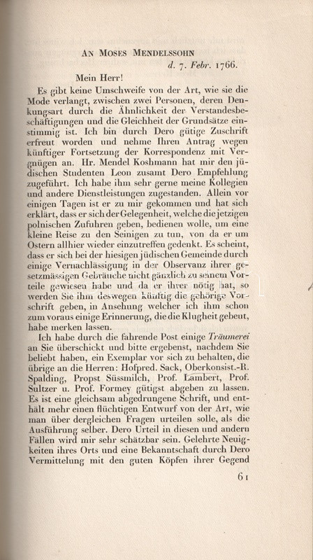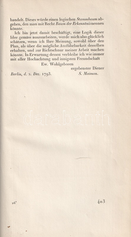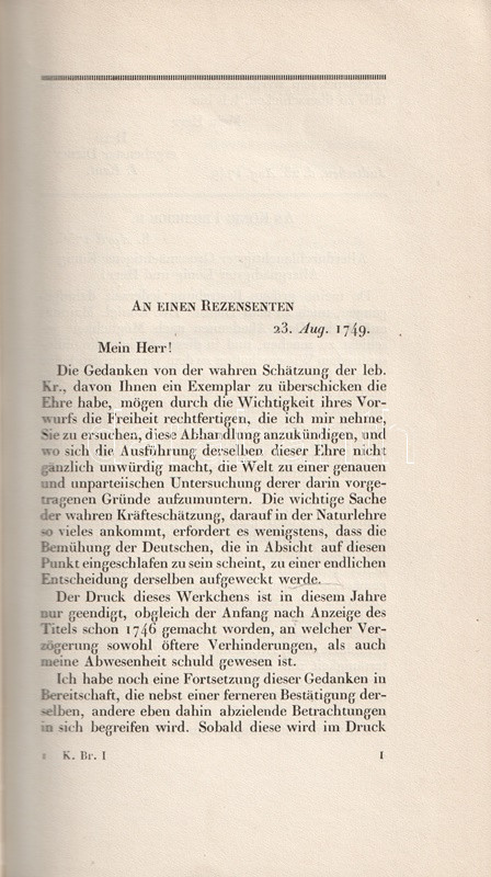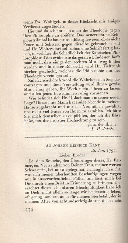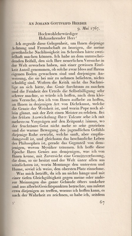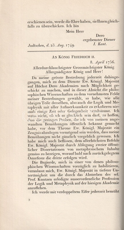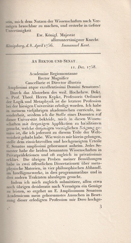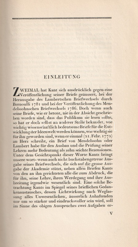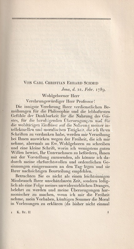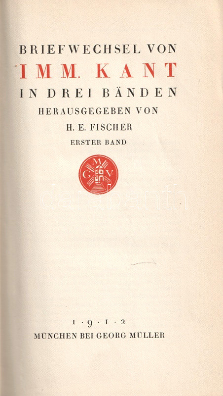 Bibliofil köteteink a königsbergi filozófus, Immanuel Kant (1724-1804) levelezését adják közre. A három kötetben teljes munka első két kötete az 1749 és 1793 között született leveleket tartalmazza, Köteteinkből éles fény vetődik a filozófus kapcsolatrendszerére: uralkodókkal éppúgy kapcsolatban állt, mint egyetemekkel, neves kortársakkal. Gyűjteményünkben így találunk II. Frigyes királynak, Johann Gottlieb Fichte, Johann Gottfried Herder, Moses Mendelssohn filozófusoknak, Christoph Martin Wieland költőnek írt leveleket is. Bibliofil köteteinket H. E. Fischer szerkesztette, a tipográfia Paul Renner könyvművész munkája. A kiadásból 100 számozott példány is készült, példányunk számozatlan.