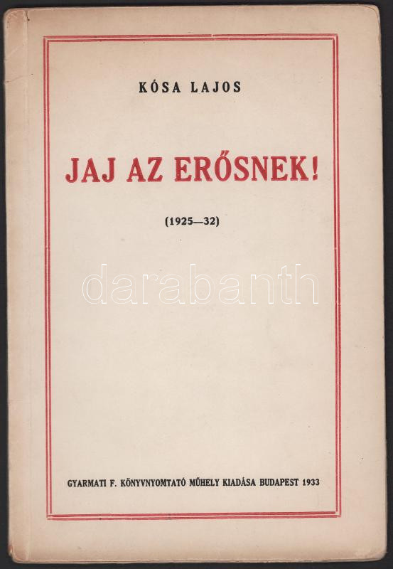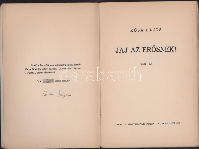 https://www.darabanth.com/en/516-Auction-philately-postcards-numismatics-artwork-books-collectibles-jewelry/520.0/Books/Books-Other-rarities~1106/Kosa-Lajos-Jaj-az-erosnek-ALAIRT-6-szamozott-peldany-Kiadoi-papirkotes-kisse-kopottas~II3501532