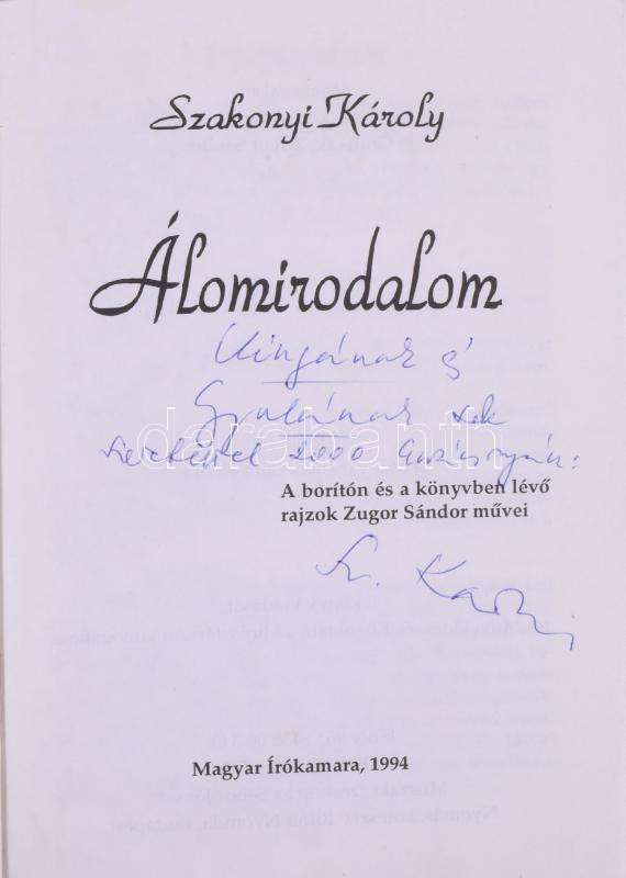 Szakonyi Károly: Álomirodalom. DEDIKÁLT! Lyukasóra-Könyvek 4. Bp., 1994, Magyar Írókamara, 82 p. Zugor Sándor rajzaival. Kiadói papírkötés.