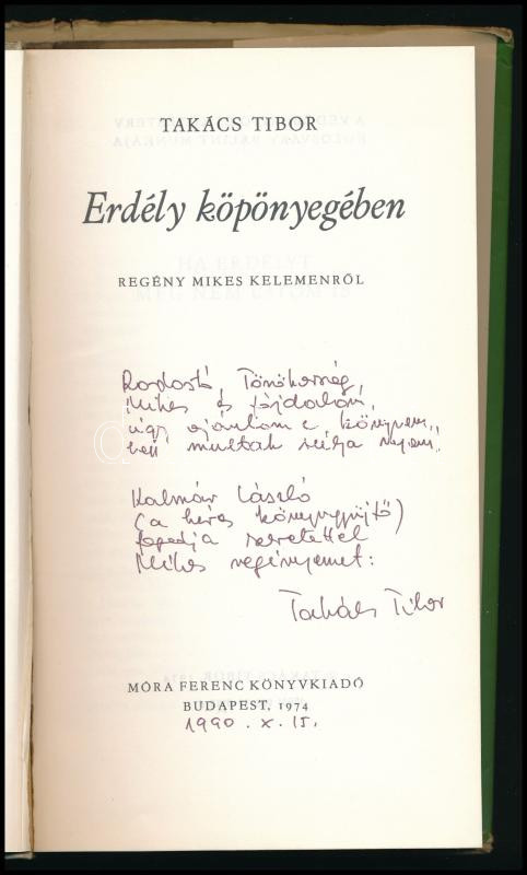 Takács Tibor: Erdély köpönyegében. Regény Mikes Kelemenről. DEDIKÁLT (2×) + Levél és meghívó. Bp., 1974, Móra. Kiadói egészvászon kötés, papír védőborítóval, kissé kopottas állapotban.