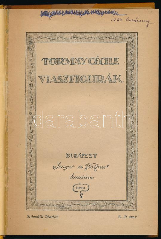 Tormay Cécile: Viaszfigurák. Bp., 1920, Singer és Wolfner, 125+[3] p. Második kiadás. Átkötött félvászon-kötésben.