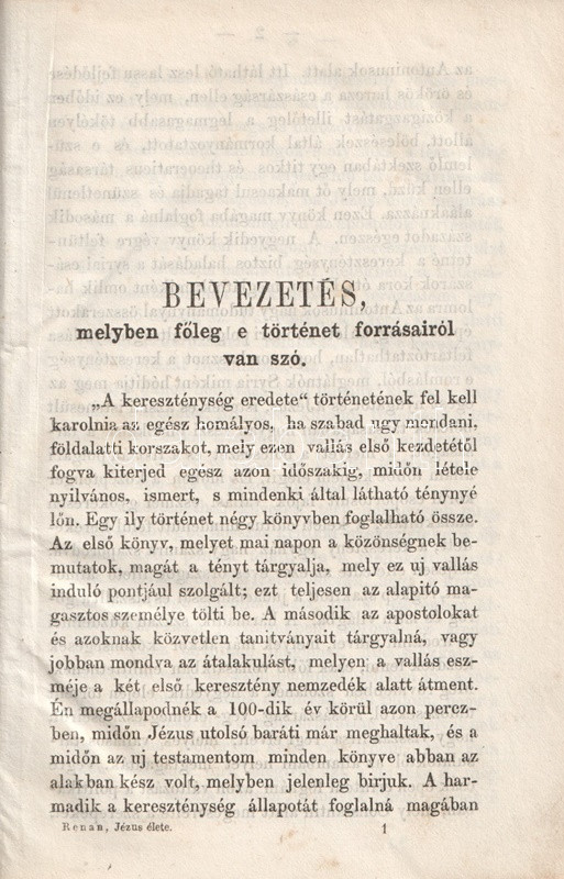 Ernest Renan (1823-1892) francia orientalista, vallástörténész. Jézus életét történeti kontextusában vizsgáló, szekuláris jellegű műve eredeti nyelven először 1863-ban jelent meg, és általános feltűnést keltett. A fordító feltüntetése nélkül készült magyar kiadás Sárosi Kornél munkája.