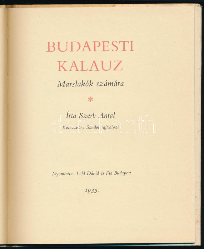 Szerb Antal: Budapesti kalauz. Marslakók számára. Bp., 1991, Officina Nova. Az 1935-ös reprint kiadása! Bp., 1935, Löbl Dávid és Fia. Kiadói kartonált kötés, foltos papír védőborítóval.