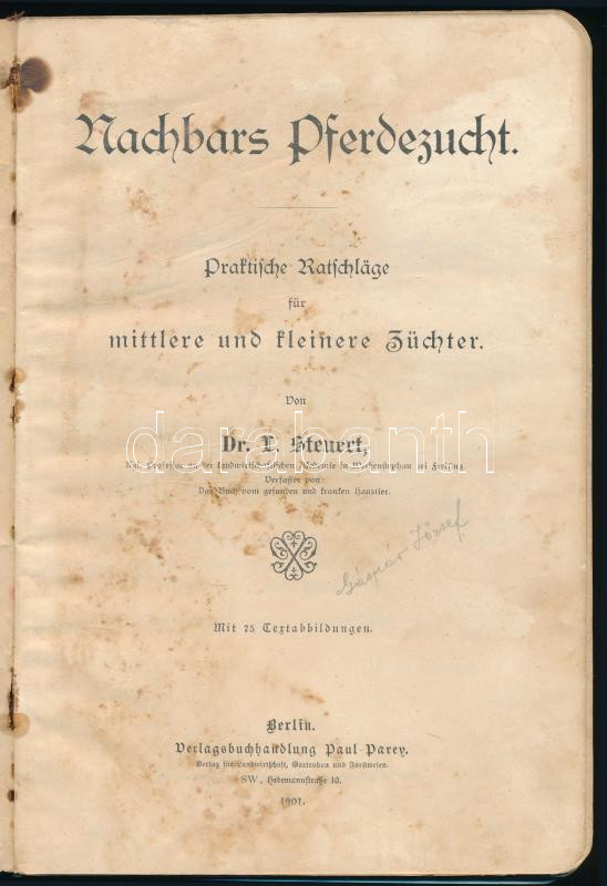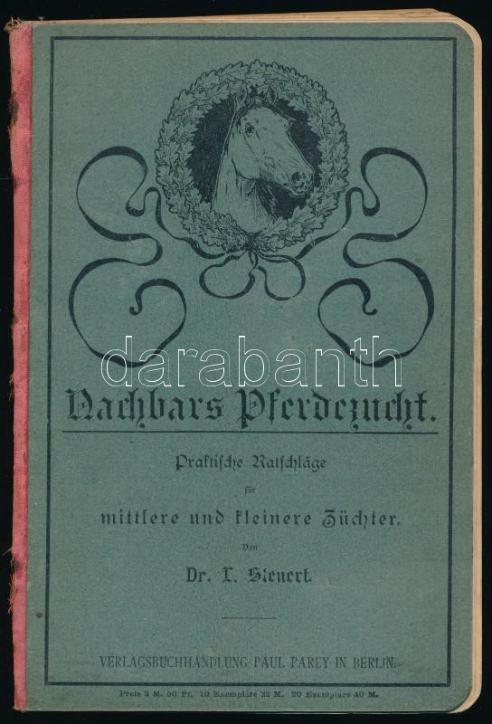 Steuert, L.: Nachbars Pferdezucht. Praktische Ratschläge für mittlere und kleinere Züchter. Berlin, 1901, Paul Parey, [6]+138+[4] p. Német nyelven. Kiadói félvászon-kötés, sérült gerinccel, helyenként foltos lapokkal, egy lap szakadt.