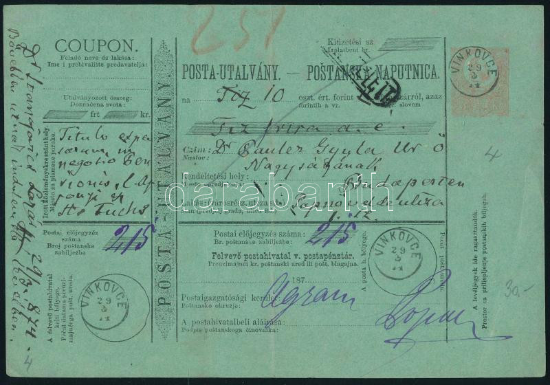 https://www.darabanth.com/en/516-Auction-philately-postcards-numismatics-artwork-books-collectibles-jewelry/520.0/Hungarian-philately-and-postal-history/Engraved-issue~32/1874-Magyar-horvat-5kr-teljes-postautalvany-szep-VINKOVCE-gyuszubelyegzessel-Budapestre~II3499804