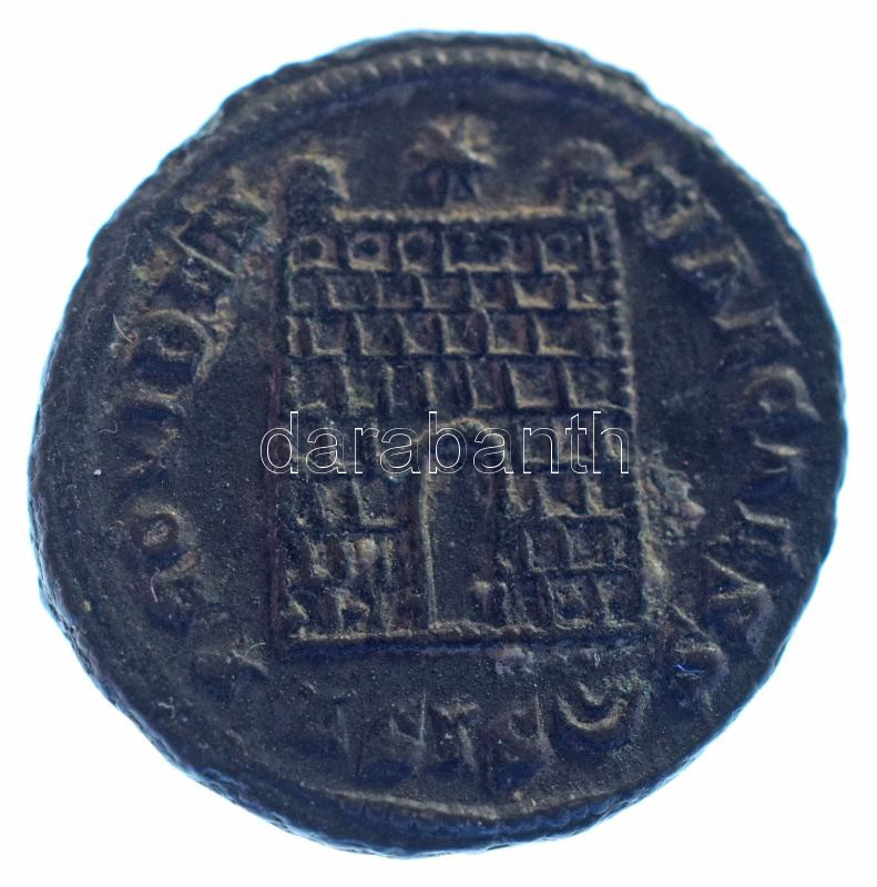 Roman Empire 326-329 / Constantius II / Siscia / Follis bronze "FL IVL CONSTANTIVS NOB C / PROVIDEN-TIAE CAESS - delta SIS double crescent" campgate with 8 layers, two turrets and star above (3,08g) C:XF patina