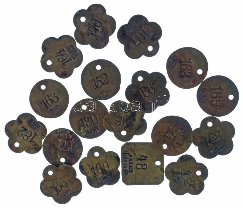 DN "Fischer" bronz bárca (18x), "102-187" közötti sorszámmal 10xklf virágformájú bárcák (32x33mm) + "130-177" közötti sorszámmal 7xklf körformájú bárcák (30mm) + "48" sorszámmal négyzetformájú bárca (32x33mm), mindegyik "FISCHER BUDÁN" gyártói jelzéssel T:XF,VF, patina