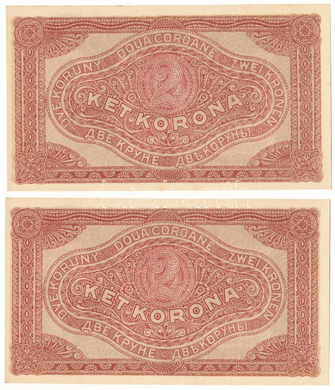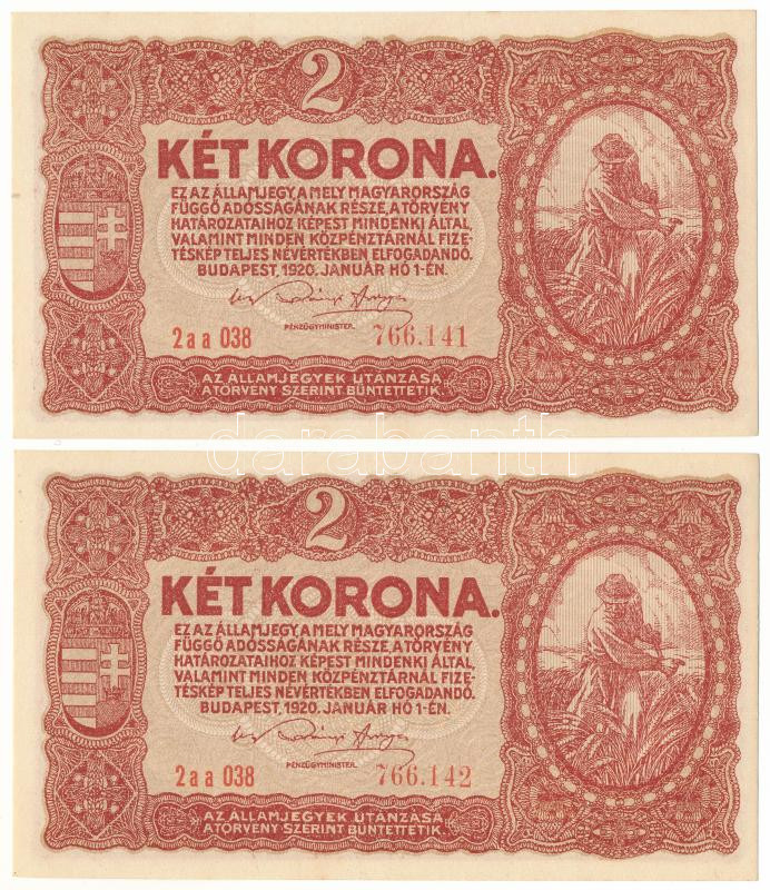 Hungary 1920. 2 Korona (2x) consecutive serials "2aa 038 766.141 - 2aa 038 766.142" C:AU,XF