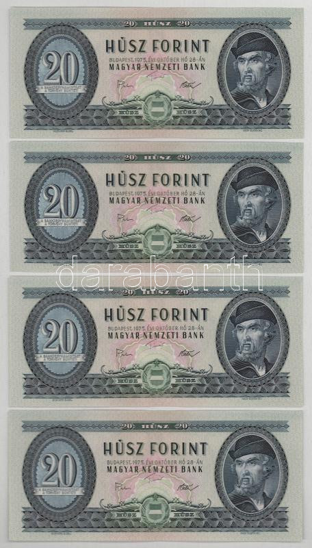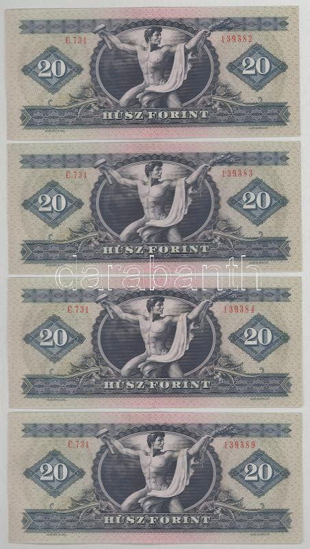 1975. 20Ft (4db) 3x sorszámkövetők + egy közeli sorszám "C 731 139382 - C 731 139384 + C 731 139389" T:XF