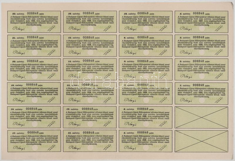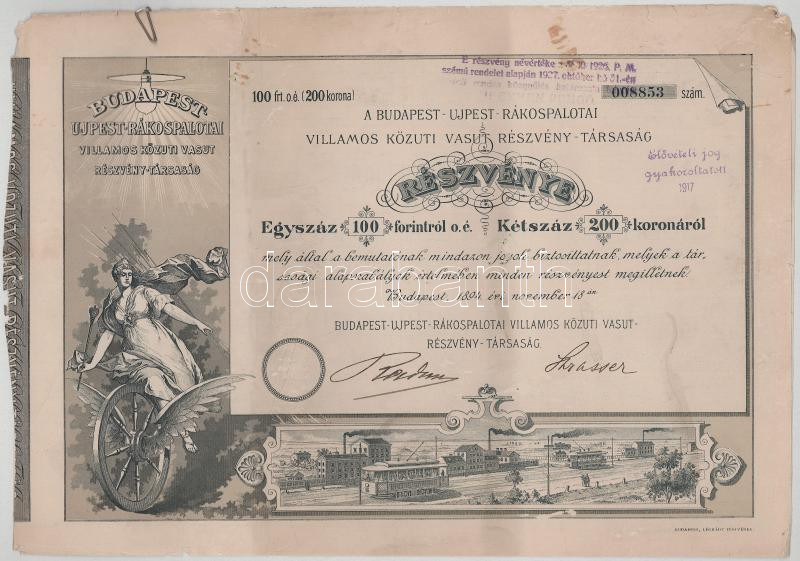 1894. Budapest "Budapest - Ujpest - Rákospalotai Villamos Közuti Vasut Részvény-Társaság" részvénye 100Ft-ról/200K-ról bélyegzésekkel, szárazpecséttel, szelvényekkel T:F,VG több helyen elvékonyodott papÃr illetve ly.