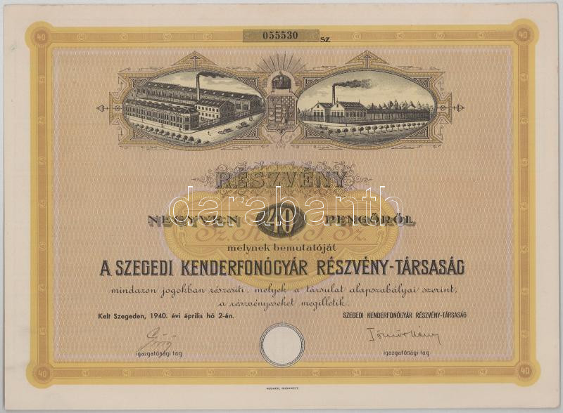 1940. Szeged "Szegedi Kenderfonógyár Részvény-Társaság" részvénye 40P értékben, szárazpecséttel, "055530" T:XF