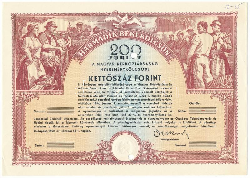 1952. Budapest "Harmadik Békekölcsön" sorsjegy 200Ft-ról, szárazpecséttel, kitöltetlen, lyukasztásokkal érvénytelenítve T:AU nagyobb sarokhajlás
