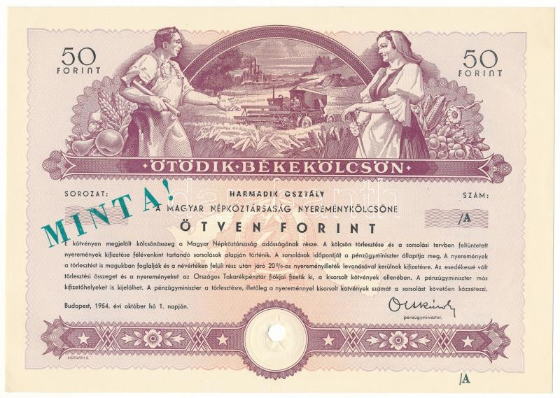 1954. Budapest "Ötödik Békekölcsön" harmadik osztály, nyereménykölcsön 50Ft-ról, szárazpecséttel, sorszám nélkül, "MINTA!" felülbélyegzéssel, lyukasztással érvénytelenÃtve T:AU