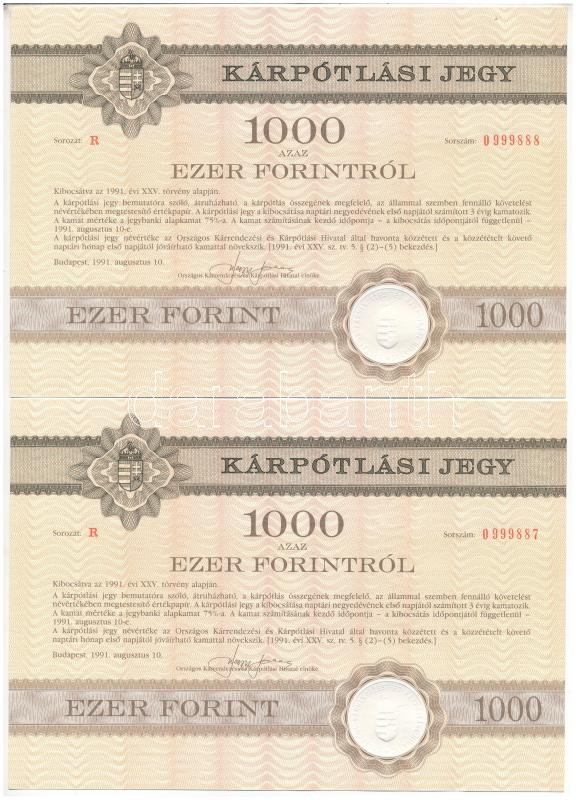 Description: 1991. Budapest "Országos Kárrendezési és Kárpótlási Hivatal " kárpótlási jegye 1000Ft-ról (2x) sorszámkövetők "0999887 - 0999888", "R" sorozat, szárazpecséttel T:AU jobb felső sarokban nagyobb sarokhajlás