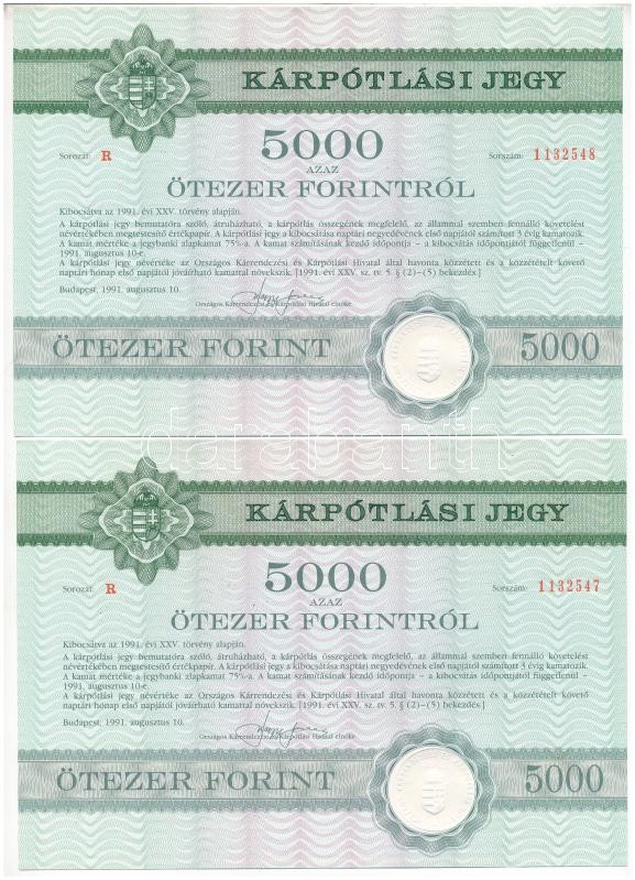 1991. Budapest "Országos Kárrendezési és Kárpótlási Hivatal" kárpótlási jegye 5000Ft-ról (2x) sorszámkövetők "1132547 - 1132548", "R" sorozat, szárazpecséttel T:XF