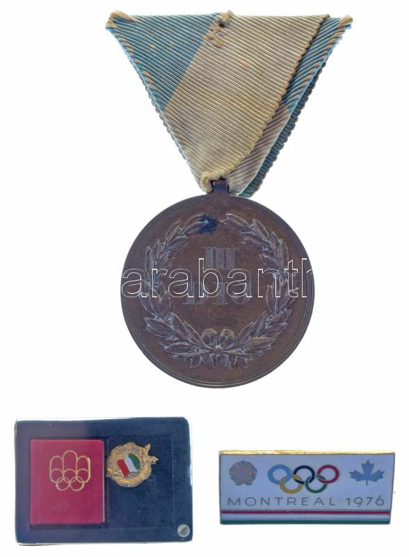 1900-1910 k. "Magyar Bicycle Club Hunnia - Budapest 1891" bronz díjérem mellszalagon, hátoldalán "III. díj" gravírozással (36mm), viseltes mellszalag, a tű hiányzik a szalagról + 1976. Montreal olimpia részvételi(?) jelvény és minikönyv, aranyozott népköztársaság címerrel enyhén sérült díszdobozban T:AU patina