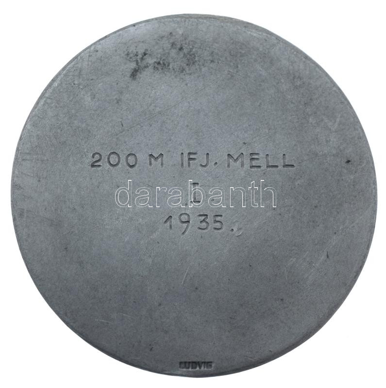 1935 k. "Magyar Úszó Szövetség" egyoldalas jelzetlen Ag(?) emlékérem hátoldalon "200 M IFJ. MELL 1935." gravírozással, "LUDVIG" gyártói jelzéssel. Szign.: Göröntsér Greff Lajos (1888-1976) (41mm) T:AU kis patina