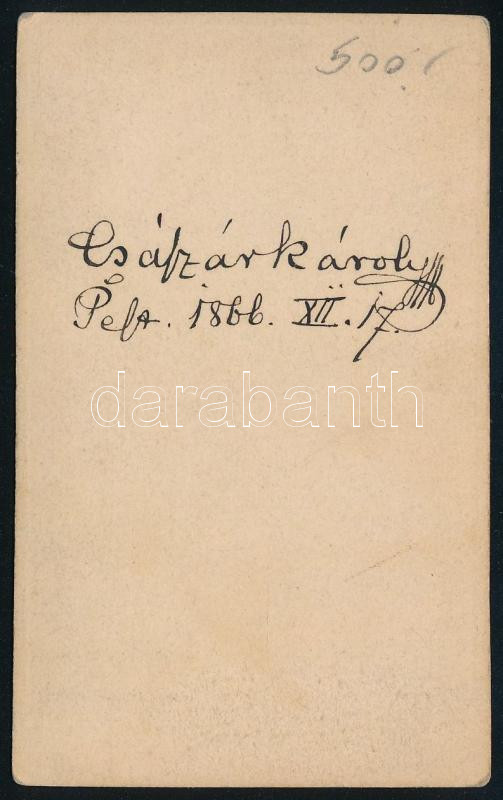 Description: 1866 Pest, Császár Károly (1842-1891) bölcsész, főreáliskolai tanár, piarista rendi szerzetes portréja, vizitkártya, a verzón (autográf?) felirattal, 10,5x6,5 cm
