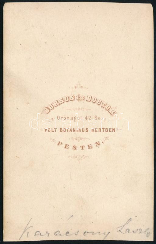 1867 Karátsonyi László jelmezben, keményhátú fotó Borsos és Doctor pesti műterméből, 10,5×6,5 cm
