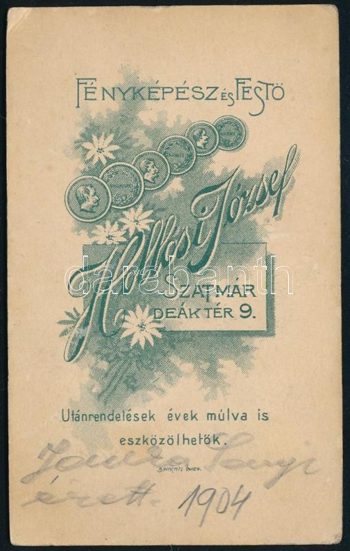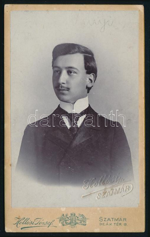 1904 Janka Sándor (1885-1961) későbbi ügyvéd, vármegyei főügyész, kormánytanácsos, író, lapszerkesztő fiatalkori portréja, vizitkártya Hollósi József szatmári (Szatmárnémeti, Satu Mare) műterméből, a hátoldalon feliratozva, 11x6,5 cm
