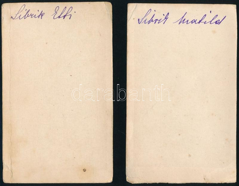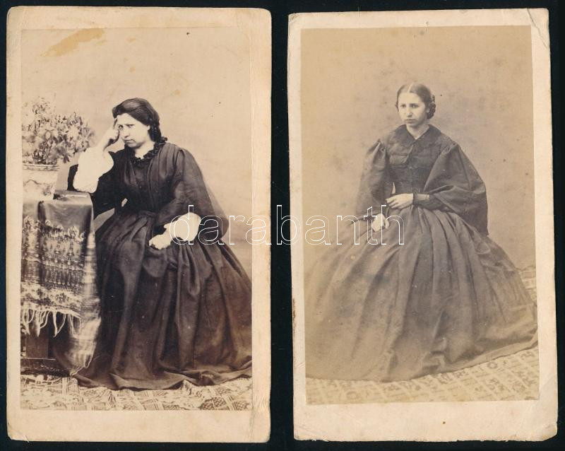 cca 1860-1870 A szarvaskendi és óvári Sibrik család (a Csém nemzetségből származó, ősi Vas vármegyei nemes család) két tagja, Sibrik Matild (1832-?) és Sibrik Etelka (1838-1920) portréi, 2 db vizitkártya, a hátoldalon feliratozva, kissé viseltes állapotban, 10,5x6,5 cm