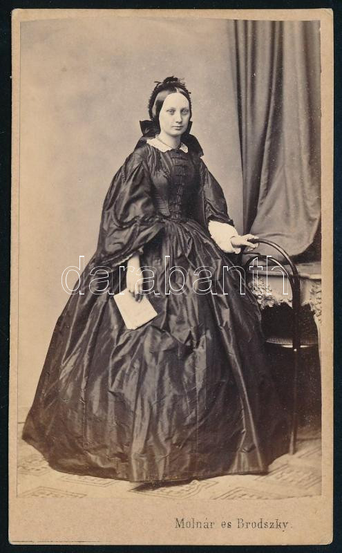 Description: cca 1860-1870 Pázmány Kálmánné, szül. kisléghi Petőcz Lenke Mária Apollonia (1842-1888), szilasi és laki Pázmány Kálmán (1833-1894) kir. törvényszéki bíró feleségének portréja, vizitkártya Molnár és Brodszky győri műterméből, 10,5x6 cm