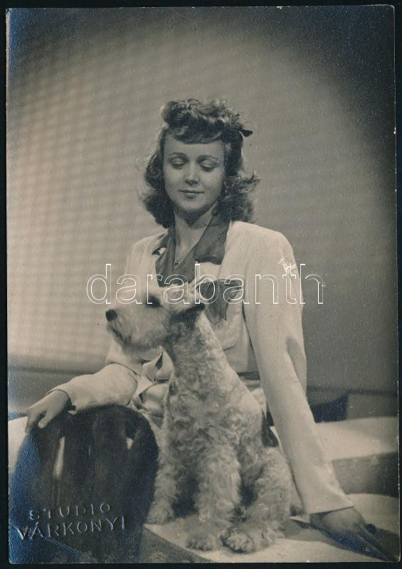 cca 1935 Hölgy kutyával, műtermi fotó a Várkonyi Stúdióból, hidegpecséttel jelzett, kis felületi sérüléssel, 14,5×10,5 cm