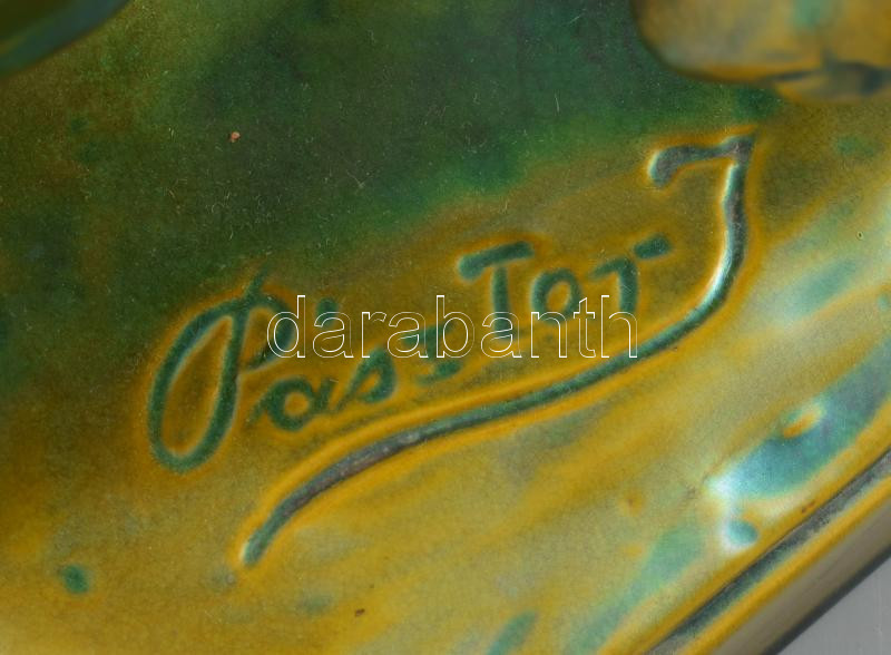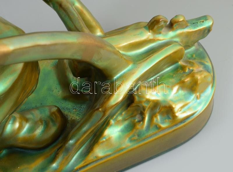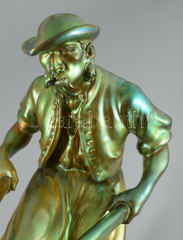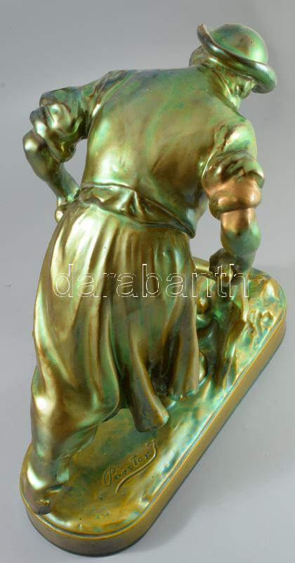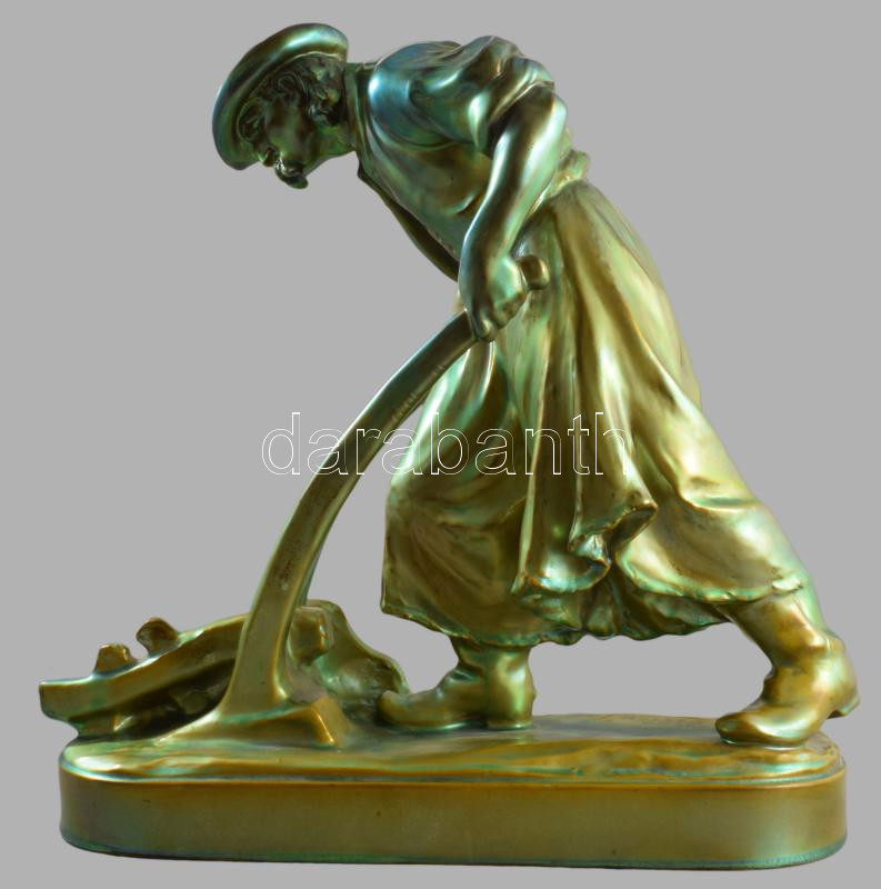 Zsolnay plasztika - Ekével szántó paraszt. Terv.: Pásztor János (1881-1945). cca 1900-1920, selyemfényű eozin mázakkal bevont öntött finomfajansz. Kis kopással, az eke fogója és a jobb váll restaurált, 41x40 cm. Csak pár darabban megvalósult formaterv!