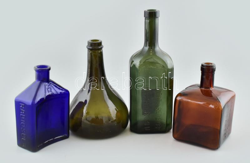Description: 4 darab régi üveg, közte kobalt kék palack, felületén domború "Radiosola Medica" felirat, kopásokkal jelzett: MR, m: 14 cm, zöld üveg palack, felületén domború "Athenstaedt & Redeker Hemelingen Bremen" felirat, kopásokkal, m: 22.5 cm alatt