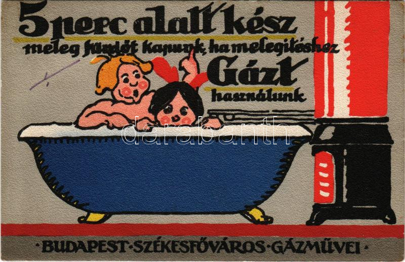 1925 Budapest Székesfőváros Gázművei reklámlap. 5 perc alatt kész meleg fürdőt kapunk ha melegítéshez Gázt használunk / Hungarian gas works advertisement