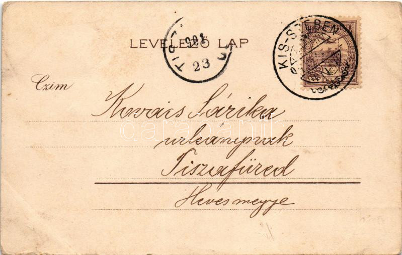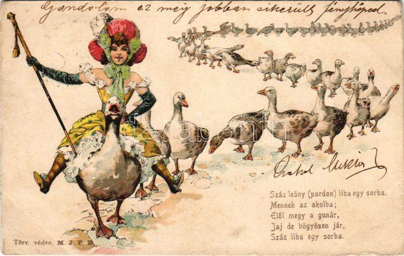1901 Száz leány (pardon) liba egy sorba... humoros művészlap / Hungarian humorous art postcard, litho s: Hegedűs-Geiger R. (tűnyomok / pinmarks)