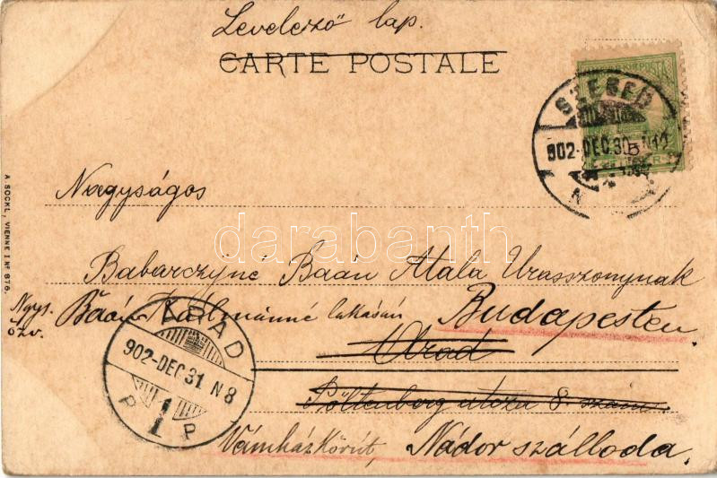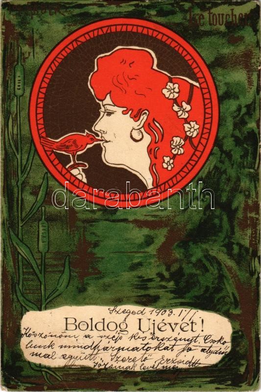 1902 Boldog Újévet! / Le Toucher / Art Nouveau lady with bird, New Year greeting art postcard. A. Sockl Vienne I. No. 876. litho s: Jos. Gaber (EB)