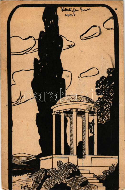 1902 Kézzel rajzolt művészlap Pozsonyból 5 fillér díjjegyes levelezőlapon / Hand-drawn art postcard sent from Bratislava + 5f Ga. (ázott sarok / wet corner)