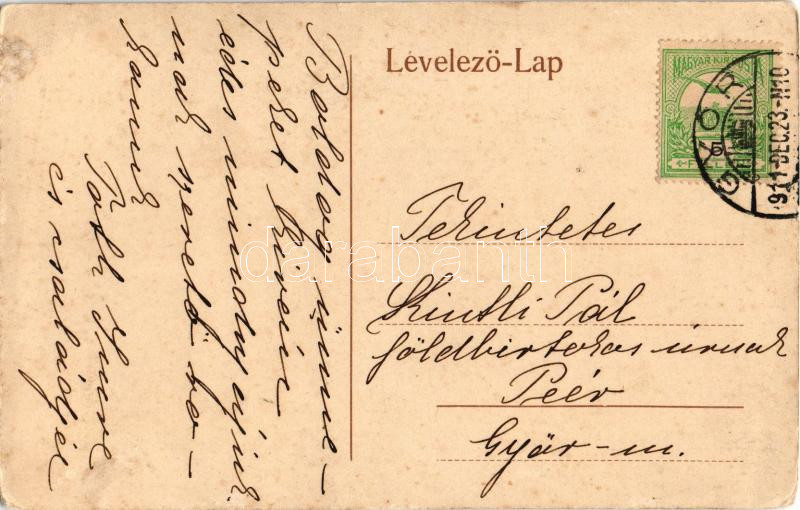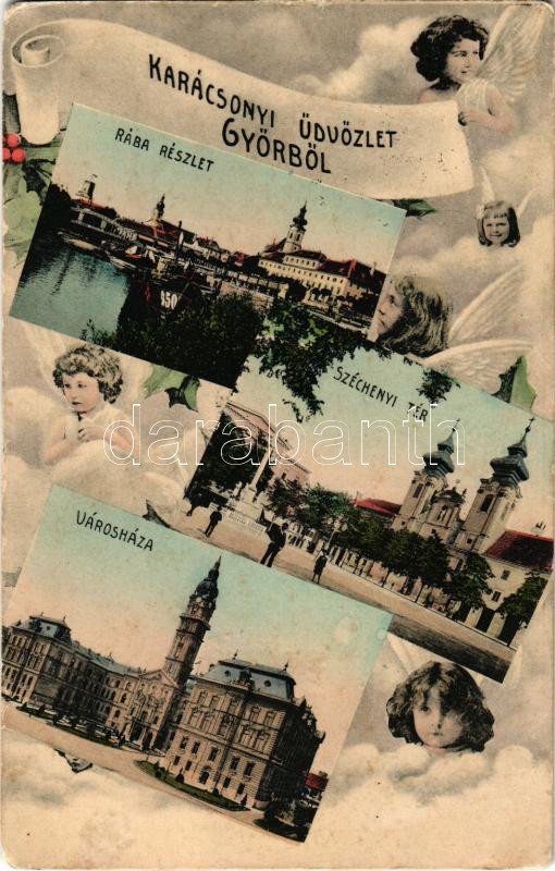 1911 Győr, Karácsonyi üdvözlet Győrből. Rába részlet, Széchenyi tér, Városháza. Szecessziós keret angyalkákkal, Art Nouveau (kopott sarkak / worn corners)
