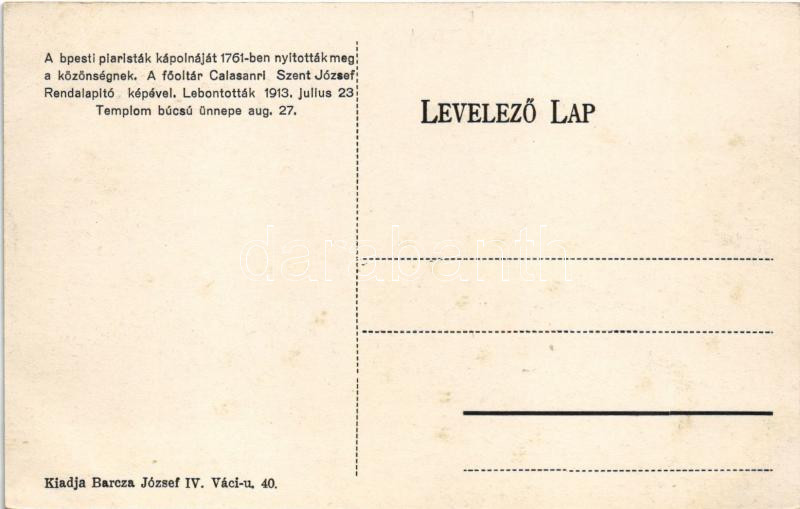 Budapest V. Piaristák kápolnája. 1761-ben nyitották meg a közönségnek, a főoltár Calasanri Szent József rendalapító képével. Lebontották 1913. július 23-án, templom búcsú ünnepe augusztus 27. Barcza József kiadása