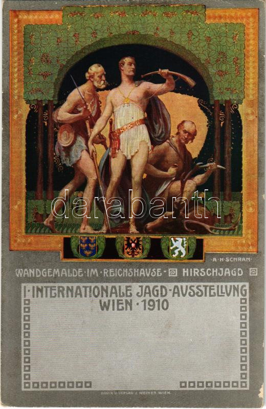 1910 Wien, Erste Internationale Jagdausstellung. Wandgemalde im Reichshause. Hirschjagd / The First International Hunting Exposition in Vienna. Advertisement art postcard s: A. H. Schram (felületi sérülés / surface damage)