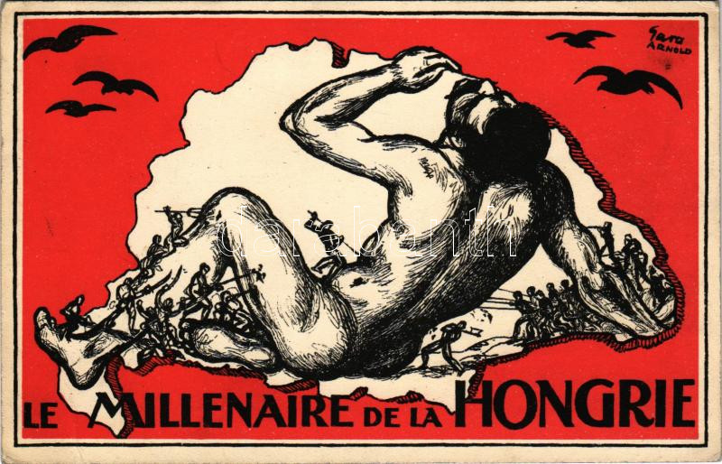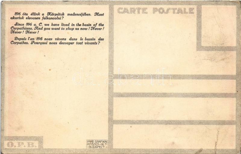 Le Millenaire de la Hongrie. 896 óta élünk a Kárpátok medencéjében. Most akartok elevenen felkoncolni? Kiadja az Országos Propaganda Bizottság. Impr. Grafikai Intézet R.T. / Hungarian irredenta propaganda art postcard, Trianon s: Gara Arnold (gyűrődés / crease)