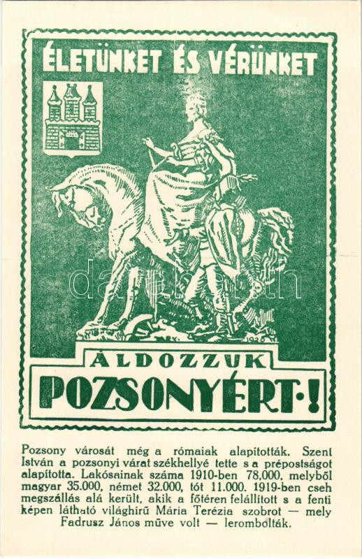 Pozsony, Pressburg, Bratislava; Életünket és vérünket áldozzuk Pozsonyért! Magyar irredenta képeslap a Mária Terézia szoborral és címerrel. Közművelődési rt. / Hungarian irredenta propaganda postcard, statue and coat of arms s: Tary (EK)