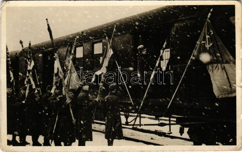 Description: Az 1848-49-es szabadságharci zászlók ünnepélyes hazahozatala Oroszországból 1941. március 23-24. A zászlók berakása Lavocznén / Russia returns the flags of the 1848-49 Hungarian War of Independence (szakadás / tear)