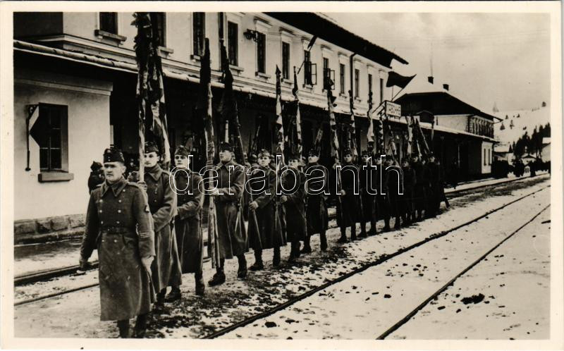 Description: Az 1848-49-es szabadságharci zászlók ünnepélyes hazahozatala Oroszországból 1941. március 23-24. A magyar honvédzászlótartók Lavoczne vasútállomásán / Russia returns the flags of the 1848-49 Hungarian War of Independence