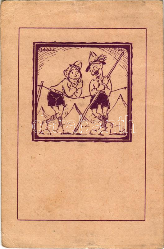 1930 Komoly tábori őrségen... Kiadja a kecskeméti 110. Bethlen Gábor cserkészcsapat 1927. / Hungarian boy scout art postcard s: Mátis (szakadás / tear)