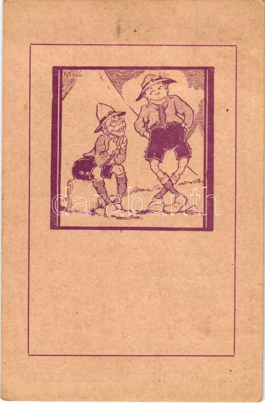 A tábor Háry Jánosa. Kiadja a kecskeméti 110. Bethlen Gábor cserkészcsapat 1927. / Hungarian boy scout art postcard s: Mátis (EK)