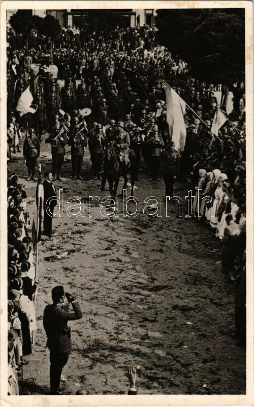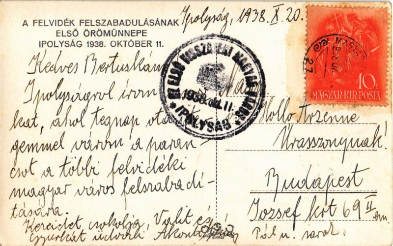 1938 Ipolyság, Sahy; bevonulás. A Felvidék felszabadulásának első örömünnepe Ipolyság 1938. október 11. / entry of the Hungarian troops + "1938 Az Első Visszatért Magyar Város Ipolyság" So. Stpl. (EK)