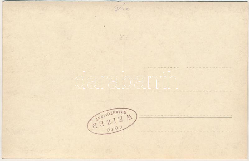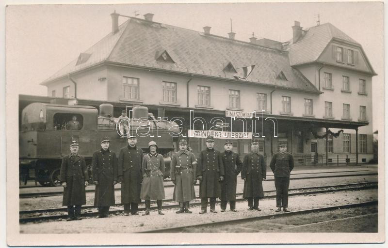 Rimaszombat, Rimavská Sobota; vasútállomás bevonuláskor, "Mindent vissza!" feliratos transzparens, magyar zászló, gőzmozdony, katonák és vasutasok / entry of the Hungarian troops, railway station with soldiers, railwaymen, irredenta propaganda sign and Hungarian flag. Foto Weizer photo