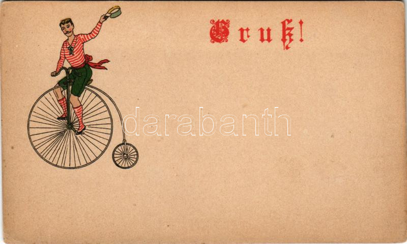 Gruß! / Man with velocipede (penny-farthing). litho (EK)