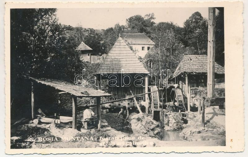 Verespatak, Goldbach, Rosia Montana; Instalatiune de steapari primitive / aranybánya, aranymosás, vízimalom. I. Tengher kiadása / gold mine, gold panning, watermill. Fotofilm Cluj